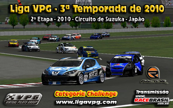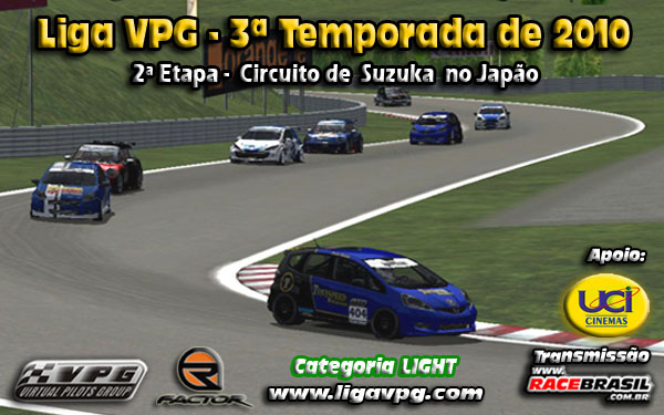Segunda etapa da terceira Temporada de 2010 da Liga VPGO circo do automobilismo virtual desembarca no Japão para a sua segunda etapa da atual temporada. Serão mais seis confrontos separados por categoria, com transmissão ao vivo a partir das 21h45min. A categoria de hoje, 27.09.2010 é a Máster, seguido pela categoria Open na quarta-feira, dia 29.09.2010 e na quinta dia 30, a categoria Special fecha a primeira semana. Na próxima semana, completamos a segunda etapa de todos os campeonatos no circuito de Suzuka com as categorias Pró, na segunda-feira, dia 04.10.2010, com a Light, dia 06 e com a Challenge, dia 07.10.2010. Todas as categorias serão transmitidas pela Race Brasil a partir das 21h45min. Circuito de Suzuka é um circuito próximo à cidade de Suzuka, no Japão. É a atual sede do Grande Prêmio do Japão de Fórmula 1. É o único circuito da história da Fórmula 1 formulado em oito, onde o piloto passa por um túnel (embaixo de uma ponte) e por uma ponte. O circuito tem 5,8 Km. Participe, torça por nossos amigos e interaja com a transmissão ao vivo, on-line pela Race Brasil, mandando mensagens ou participando do Chat na arquibancada virtual. A transmissão é livre e gratuita para todos os internautas. Informações: Liga VPG – www.ligavpg.com Site de transmissão on-line parceiro da Liga VPG: Apoio: – Blog Carros e Corridas: http://sobrecarrosecorridas.com.br/ Fotos do circuito de Suzuka no Japão: