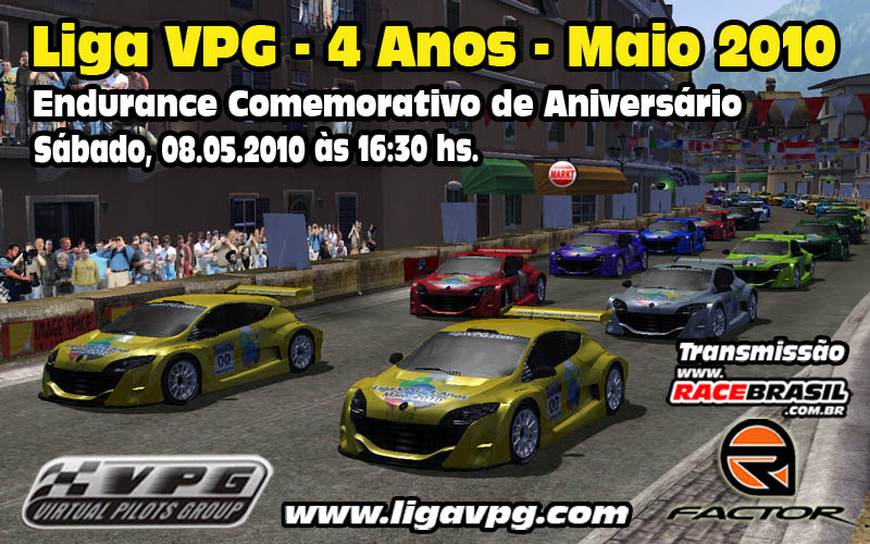 | A liga VPG, de automobilismo virtual, abre hoje, dia 17.05.2010, às 21h45min, com transmissão ao vivo, sua segunda temporada de 2010.